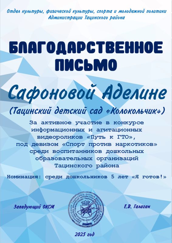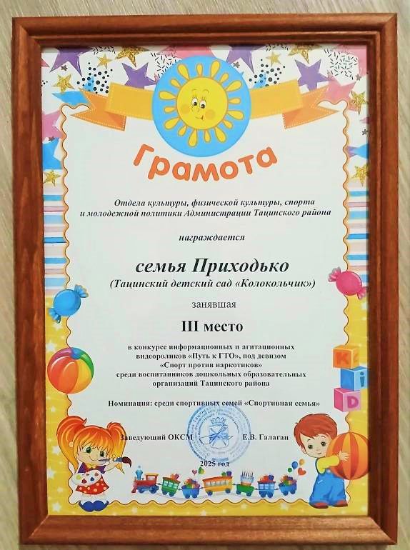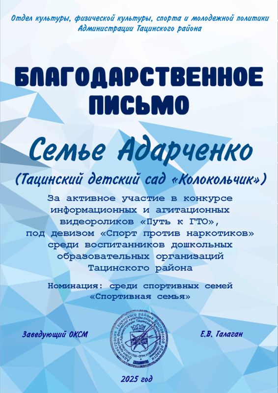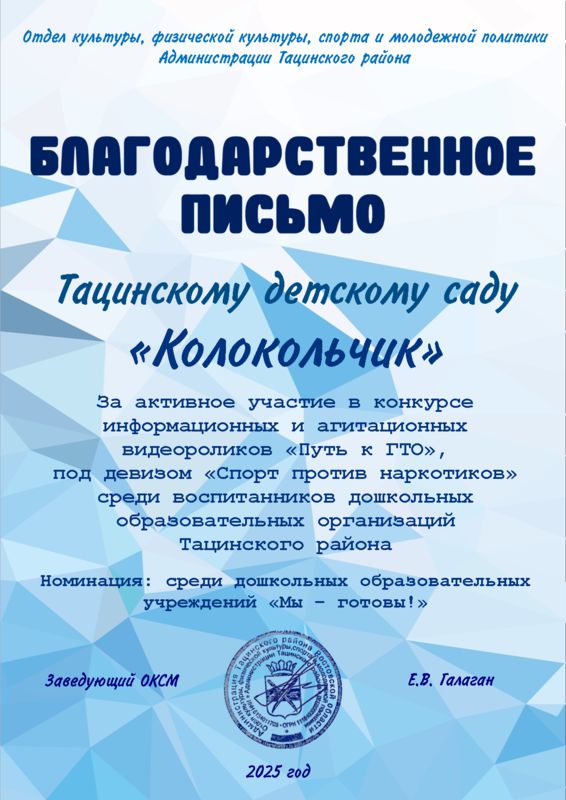 Семья Адарченко Арины (1 младшая группа «Березка» воспитатель Мецерицян Р.А.), семья Сафоновой Аделины ( старшая группа «Лазорик» воспитатель Забродина И.П.) и видеоролик детского сада в номинации «Мы готовы!» отмечены Благодарственными письмами отдела культуры, физической культуры, спорта и молодежной политики Администрации Тацинского района