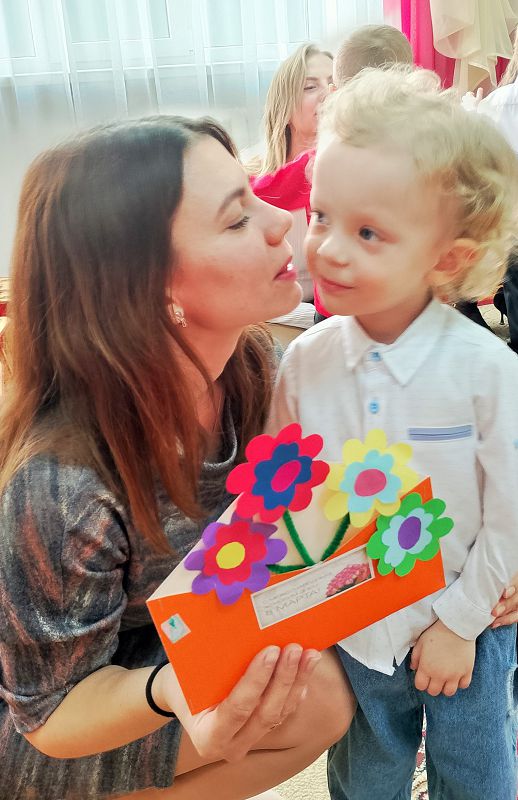 А самым трогательным моментом праздника для родителей стал общий танец детей и мам. В заключении чудесного праздника каждый малыш поздравил свою любимую мамочку красочной открыткой сделанной своими руками. Дети были такие нарядные и красивые, в зале царила атмосфера весенней радости и счастья. Все получили приятные впечатления от этого праздника.