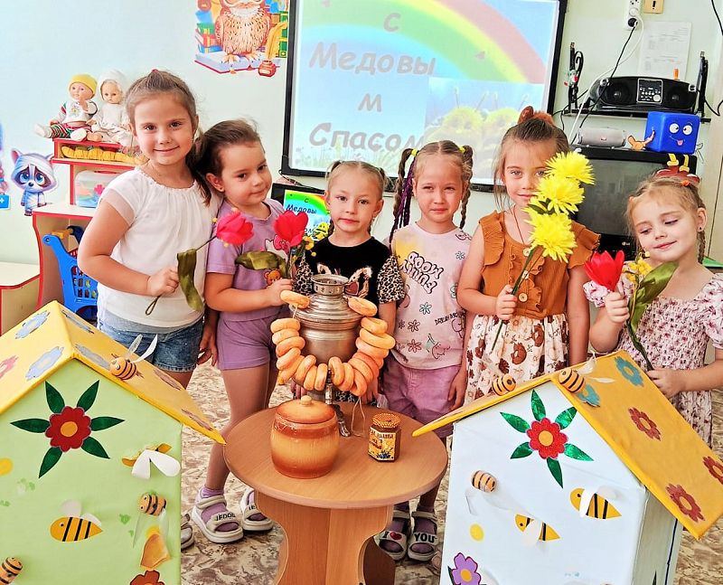 Сегодня в группе «Лазорик» царила атмосфера знакомства с интересным вкусным праздником – Медовым Спасом .Ребята погрузились в мир русских традиций узнали много нового о пчелах и целебных свойствах меда. Дети с интересом слушали историю происхождения Медового Спаса, откуда пошла традиция освящать мед и почему этот праздник так важен для нашего народа. Из познавательной беседы о пчеловоде ребята узнали о его нелегком труде, об устройстве улья и о том как получается мед.