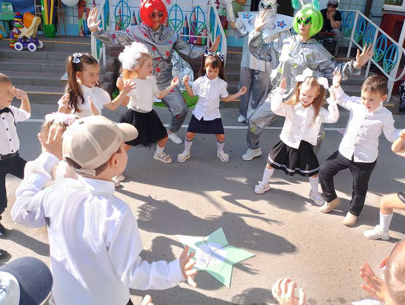 Сегодня 1 сентября они стали участниками удивительного и прекрасного праздника Дня знаний. Воспитанники помогли инопланетянам Уму (Корнеева Ю.А.) и Хруму (Клименко А.А.) расколдовать гору знаний, на которую наложил свои чары волшебства Злобус Мракозорий (Казанцева М.А.). Ребята с удовольствием «летали на летающих тарелках», «собирали метеориты», участвовали во флэш-мобе. Гора расколдована, а в ней подарки.