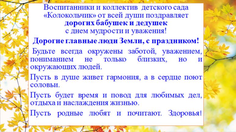 В преддверии этого праздника были проведены беседы «Наши добрые и мудрые, главные люди!». Ребята услышали, почему подобным праздникам придается большое значение, как важно оказывать внимание старшему поколению, как здорово дарить им частичку своего добра и тепла.