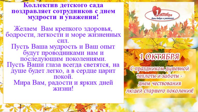 В нашем детском саду стало доброй традицией поздравлять сотрудников, ушедших на пенсию, с днем мудрости и добра! Тем самым выражая уважение, поддержку, заботу и любовь к старшему поколению.