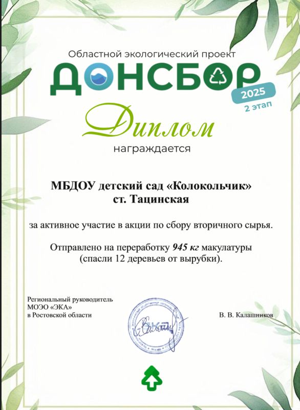 В октябре воспитанники, родители и сотрудники детского сада приняли участие во втором этапе областного эколого-просветительского проекта «ДОНСБОР – 2025» , направленного на популяризацию идей ресурсосбережения и бережного отношения к окружающей природной среде. В рамках проекта осуществлялся сбор макулатуры.