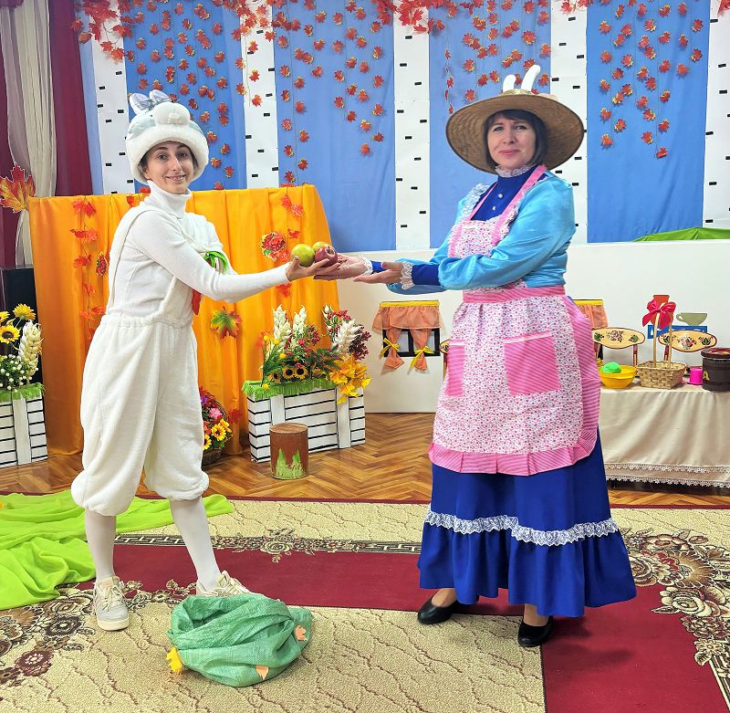 Ребята группы « Колосок » и «Лазорик » вместе с воспитателями Ляженко Е.А ,Корнеевой Ю.А, Забродиной И.П., Громадиной А.А Мизенко С.Н. показали инсценировку сказки В. Сутеева « Мешок яблок ».