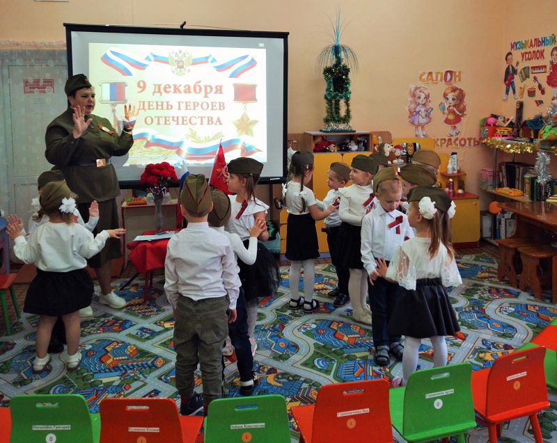 Дети узнали, что герой - это тот, кто совершил подвиг, проявив личное мужество, стойкость, готовность к самопожертвованию. Во время занятия дети посмотрели презентацию: «Герои России, в разные времена», познакомились с героями – полководцами: Александром Васильевичем Суворовым, Михаилом Илларионовичем Кутузовым, Георгием Константиновичем Жуковым, а так же с некоторыми героями нашего времени, участвующими в СВО, чтобы дети имели наглядное представление о людях, которым было присвоено почётное звание. Ребятам рассказали, за какие заслуги присуждается звание Герой России.