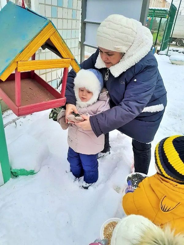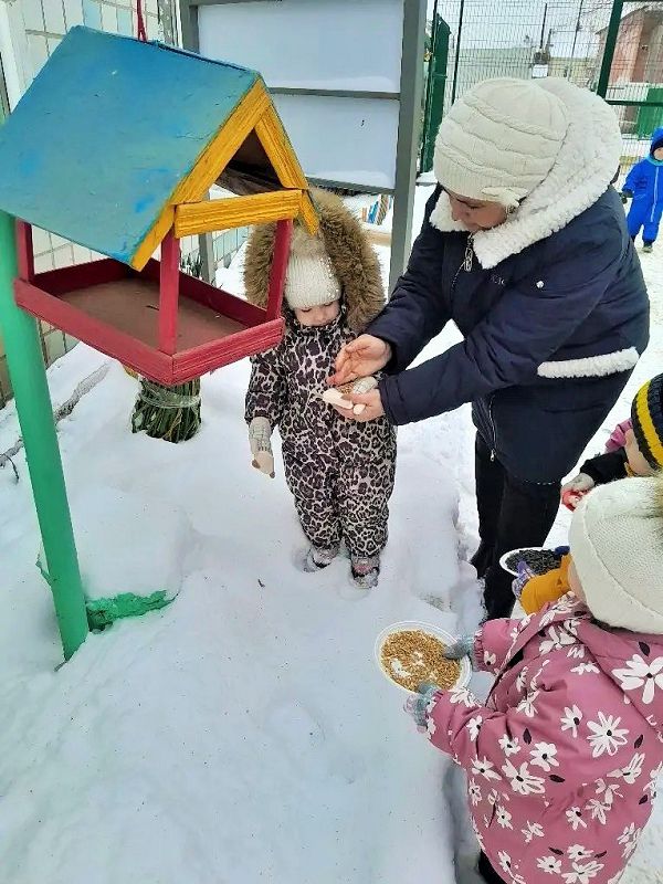 На территории детского сада развешены кормушки для птиц и во время каждой прогулки дети совместно с воспитателем и родителями наполняют кормушки разнообразным «угощением». Воспитанники не только наблюдают за своими пернатыми друзьями, но и играют в подвижные игры про птиц. Дошколята теперь точно знают, что они делают важное и хорошее дело - помогать пернатым друзьям в трудное для них зимнее время. В результате проведённой работы дети узнали много нового и интересного, усвоили важное правило: "Птиц не нужно обижать, птичкам нужно помогать!"