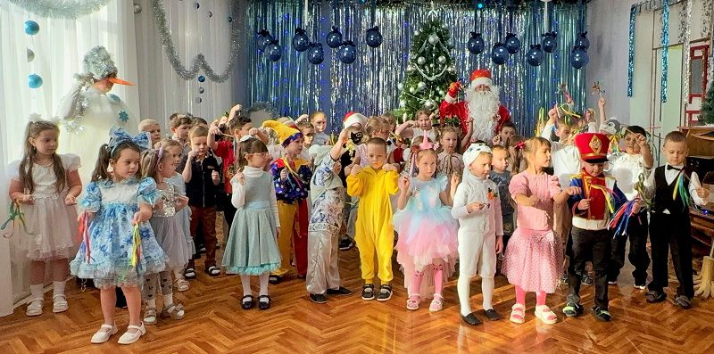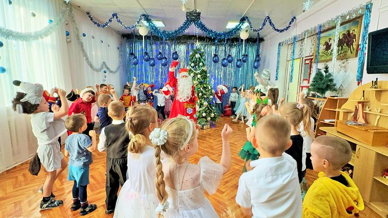 На развлечении дети веселились у новогодней елки: играли, танцевали и пели песни. А в конце праздника ёлочка погасила свои огоньки…