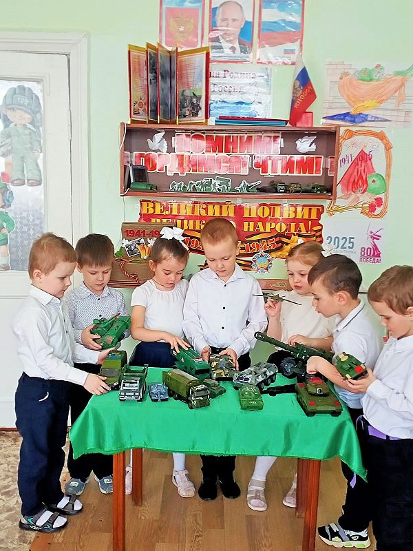 Для наглядности и лучшего усвоения материала в группе был создан военно-патриотический уголок. Здесь представлены различные альбомы о Великой Отечественной войне, фотографии военных лет, иллюстрации, рассказывающие о жизни детей во время войны выставка военной техники, созданная вместе с родителями.