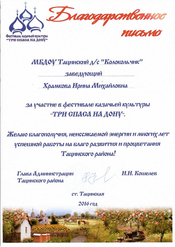 Благодарственное письмо Главы Администрации Тацинского района за участие в фестивале казачьей культуры «Три спаса на Дону»
